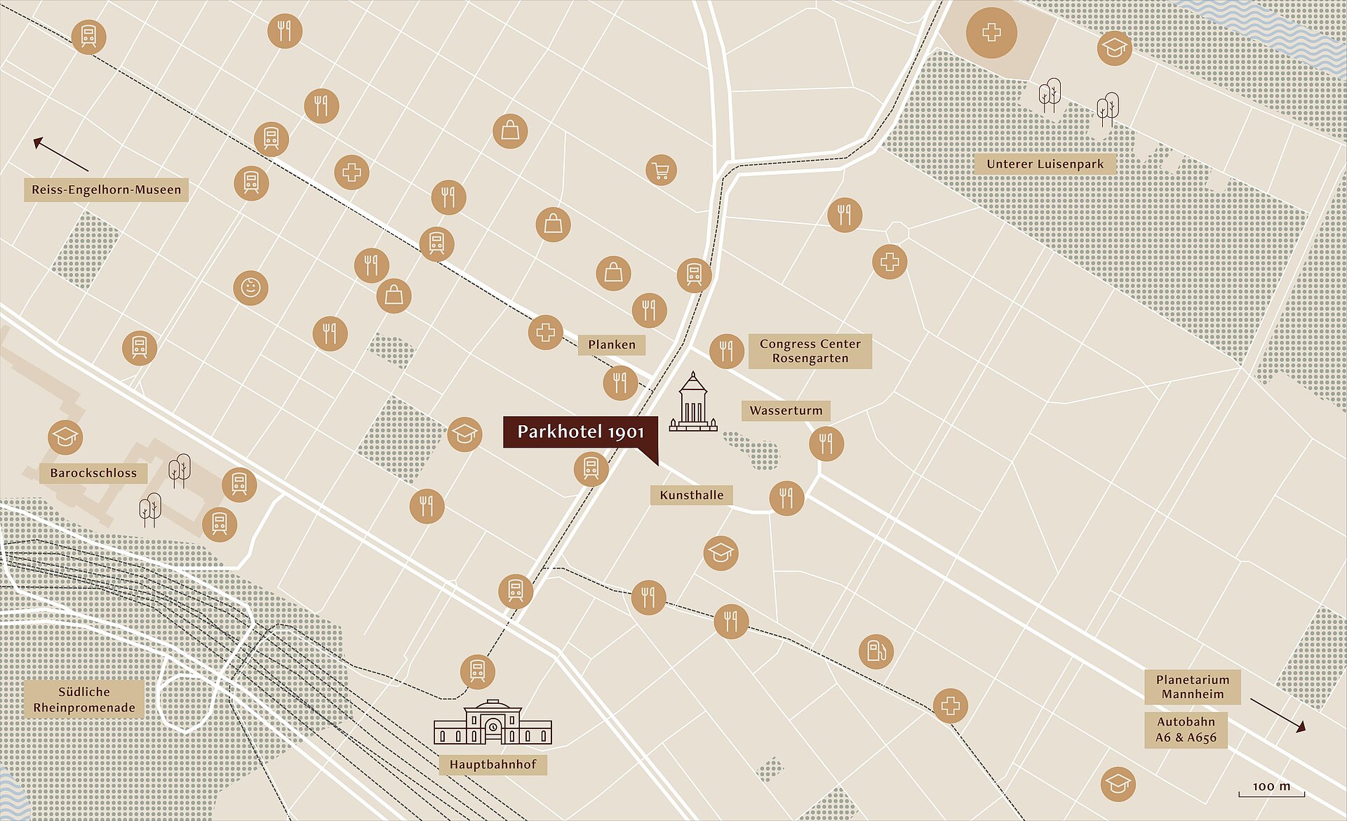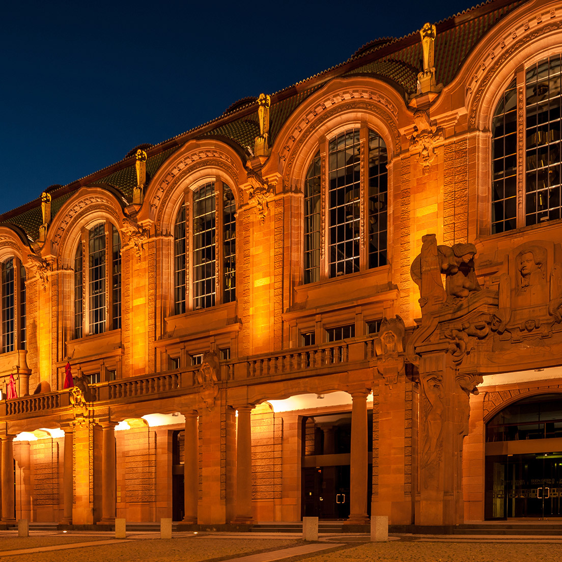 Das Jugendstil-Ensemble des Kongress- und Eventzentrums entstand 1903 – nur zwei Jahre nach Eröffnung des Parkhotel 1901 – nach einem preisgekrönten Entwurf des Berliner Architekten Bruno Schmitz. Zusammen mit einer Reihe repräsentativer Wohn- und Geschäftshäuser, der neu gebauten Mannheimer Kunsthalle und unserem Hotelgebäude umrahmt der „Rosengarten“ das einmalig schöne Jugendstil-Ensemble des Friedrichsplatzes mit dem Wasserturm.